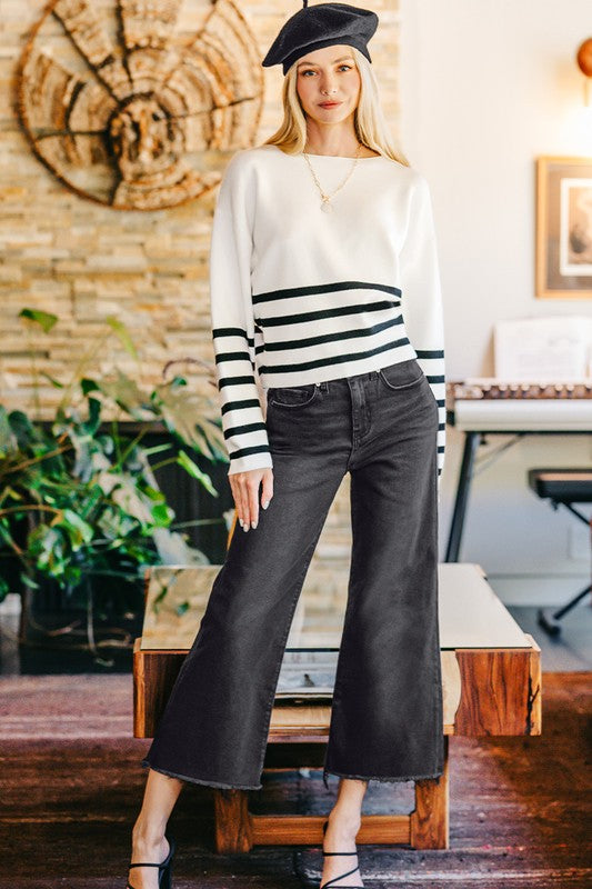Elevate your edgy style with these high-rise washed black cropped jeans featuring a daring wide-leg silhouette and frayed hems for a bold, lived-in look. The stretch fabric ensures comfortable movement, while the 10.5" front rise and 25" inseam create a flattering, cropped fit that commands attention. With a generous 21.5" leg opening, these jeans make a fearless statement wherever you go.