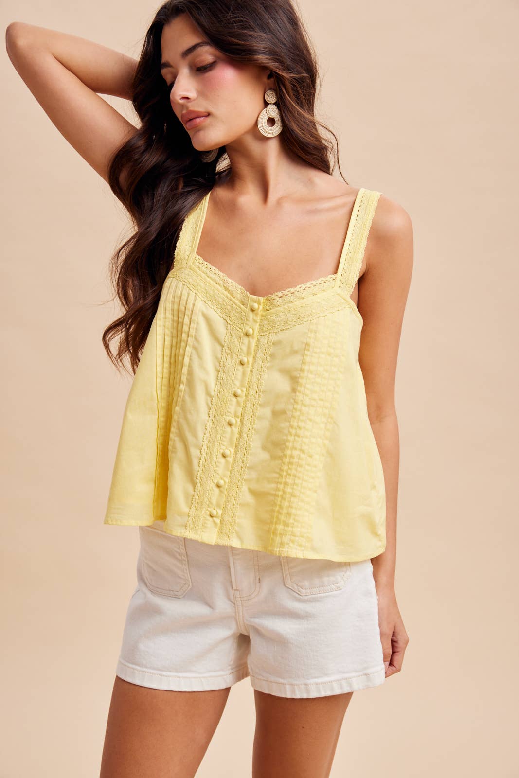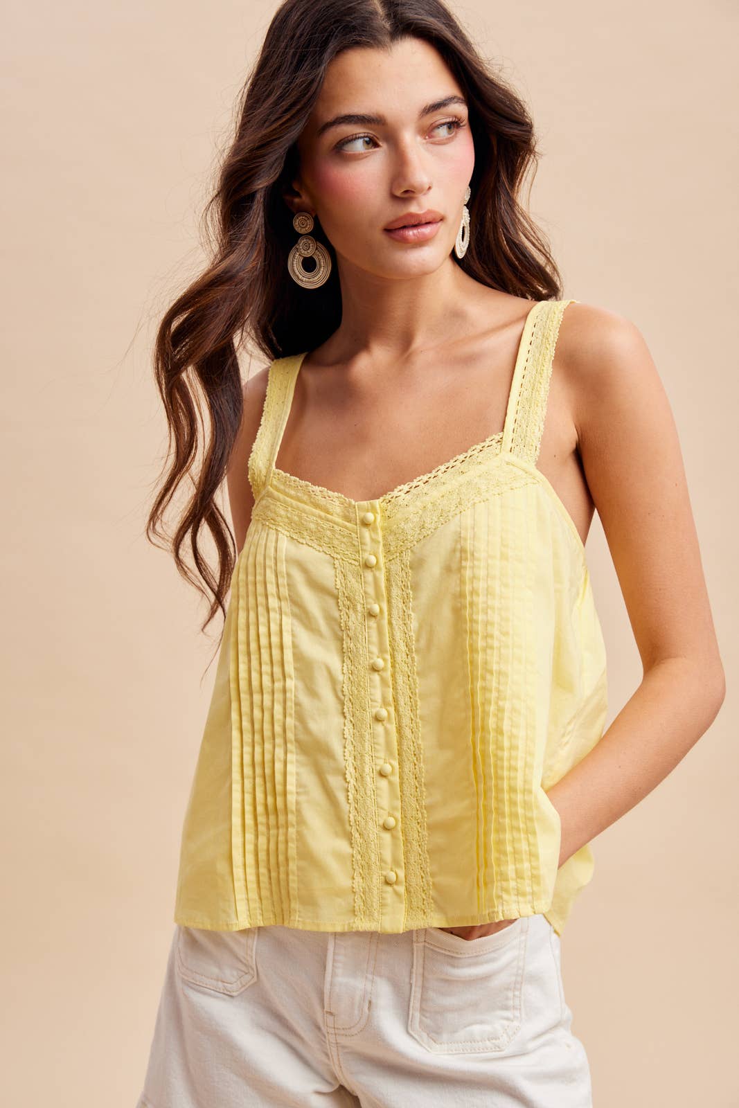 Effortlessly elegant, this cotton tank combines breathable comfort with refined details. The delicate lace overlay and pintuck pleats add visual interest, while adjustable lace shoulder straps ensure a customized fit. Functional cover buttons and a lined front provide both style and practicality. A versatile wardrobe essential that transitions seamlessly from casual days to evening occasions.