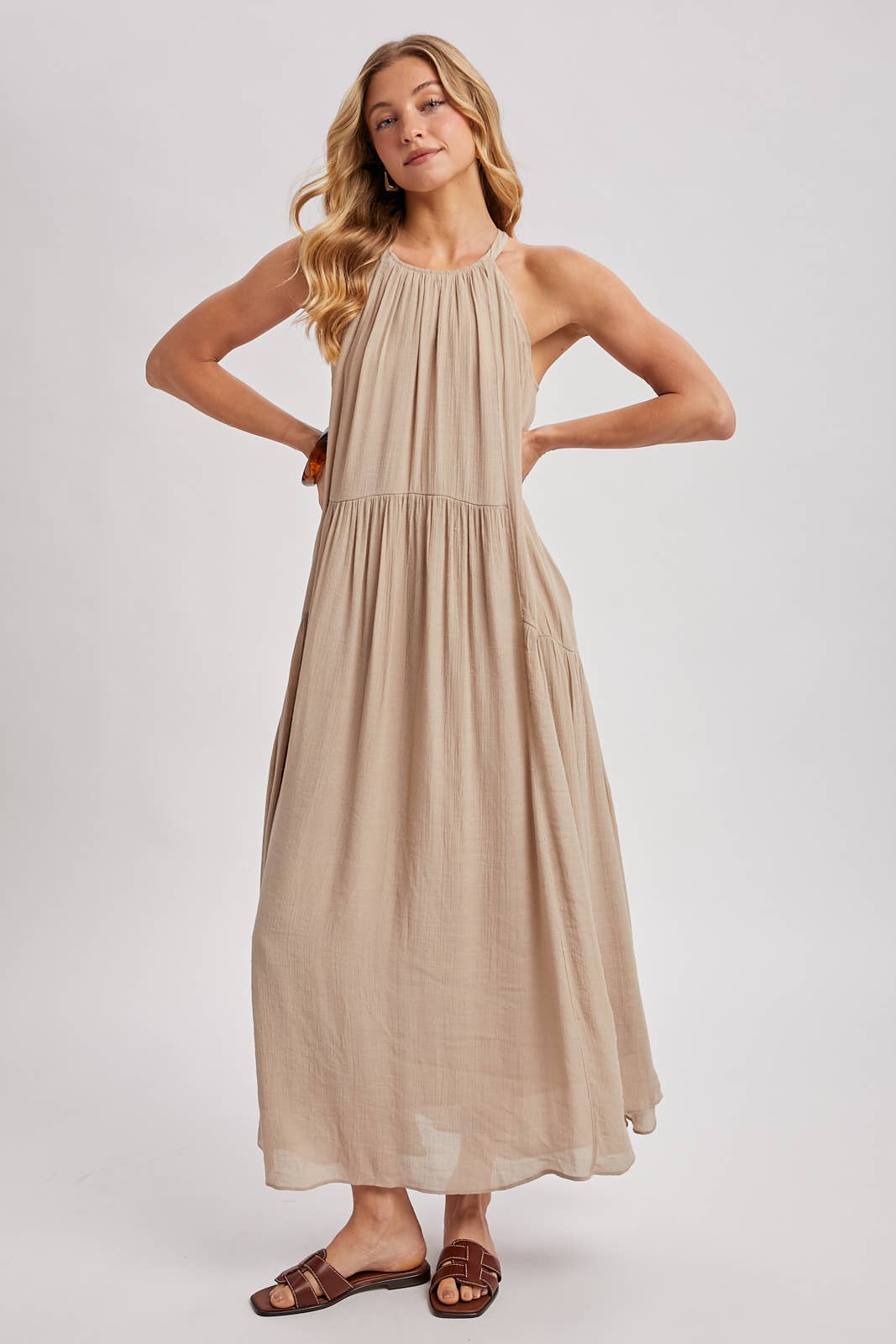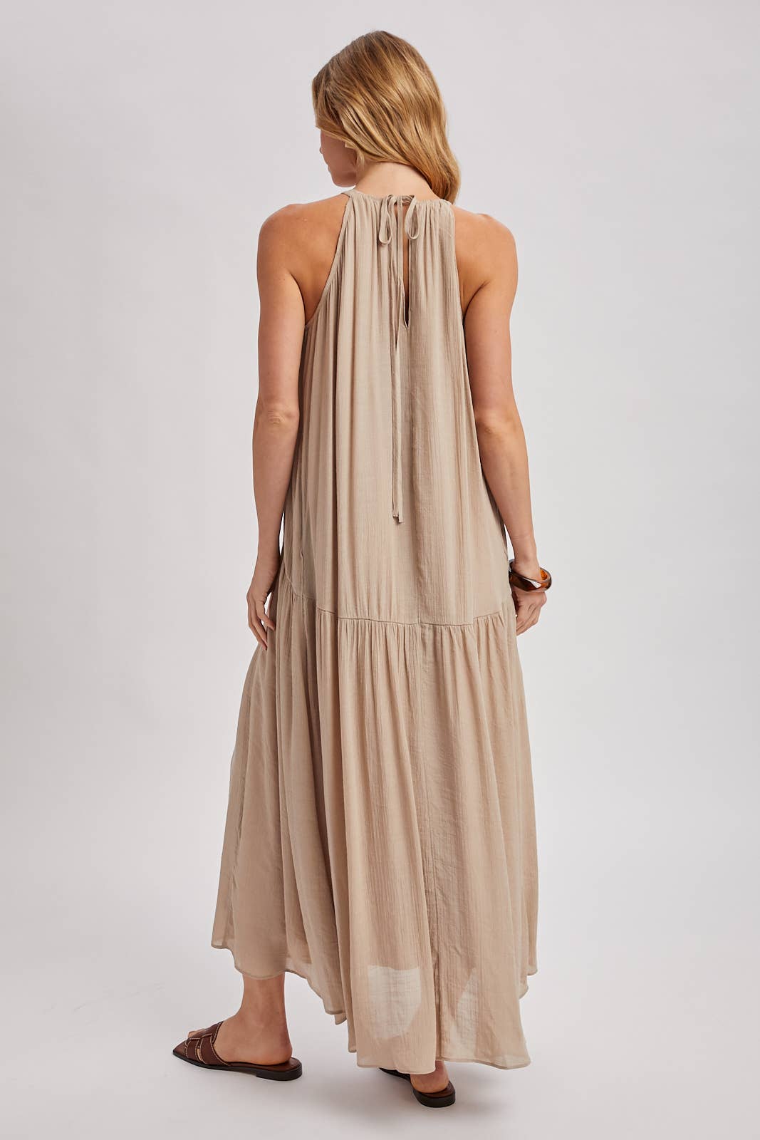 This is a captivating maxi-length halter dress, designed with a gracefully relaxed and flowing silhouette, distinguished by its high, gathered neckline, a multi-tiered skirt that adds movement and volume, and practical side pockets, all crafted from a lightweight fabric that boasts an appealing crinkled or textured finish.