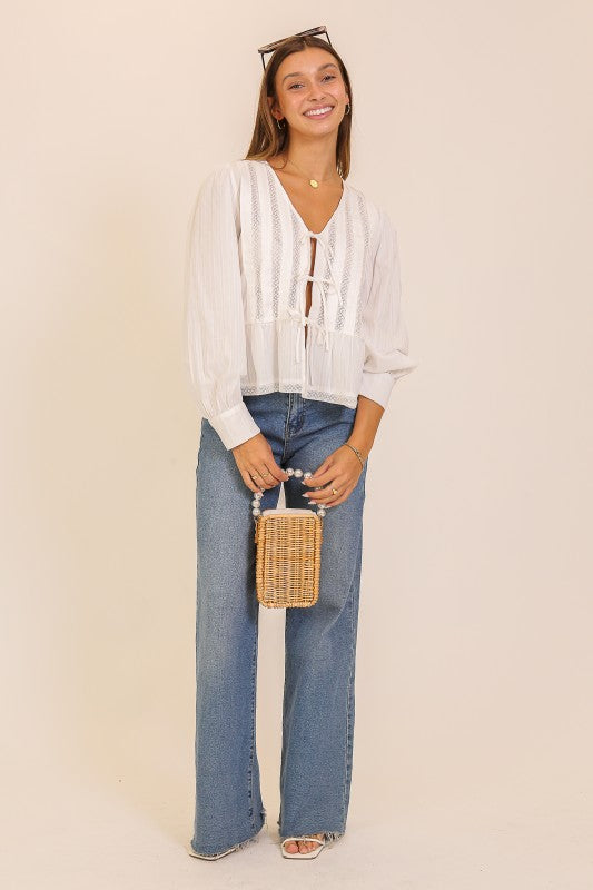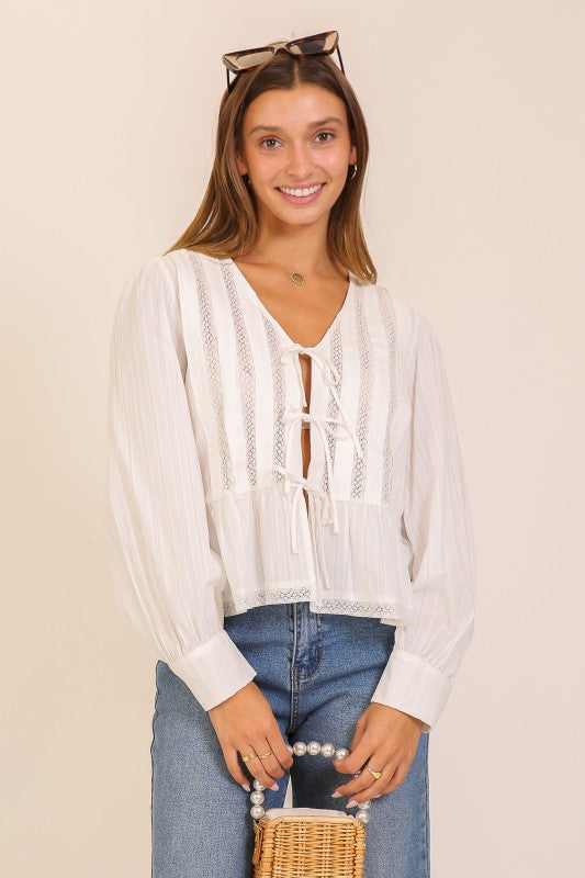 Featuring a flattering V-neckline and delicate lace panel detailing down the front, this blouse is all about feminine charm and effortless polish. The long bishop sleeves with wide buttoned cuffs give a graceful silhouette, while the soft gathered waist creates a flattering peplum effect. Designed with three charming tie-front closures for an adjustable fit, this piece works beautifully tucked in or worn loose for a relaxed, breezy vibe.
